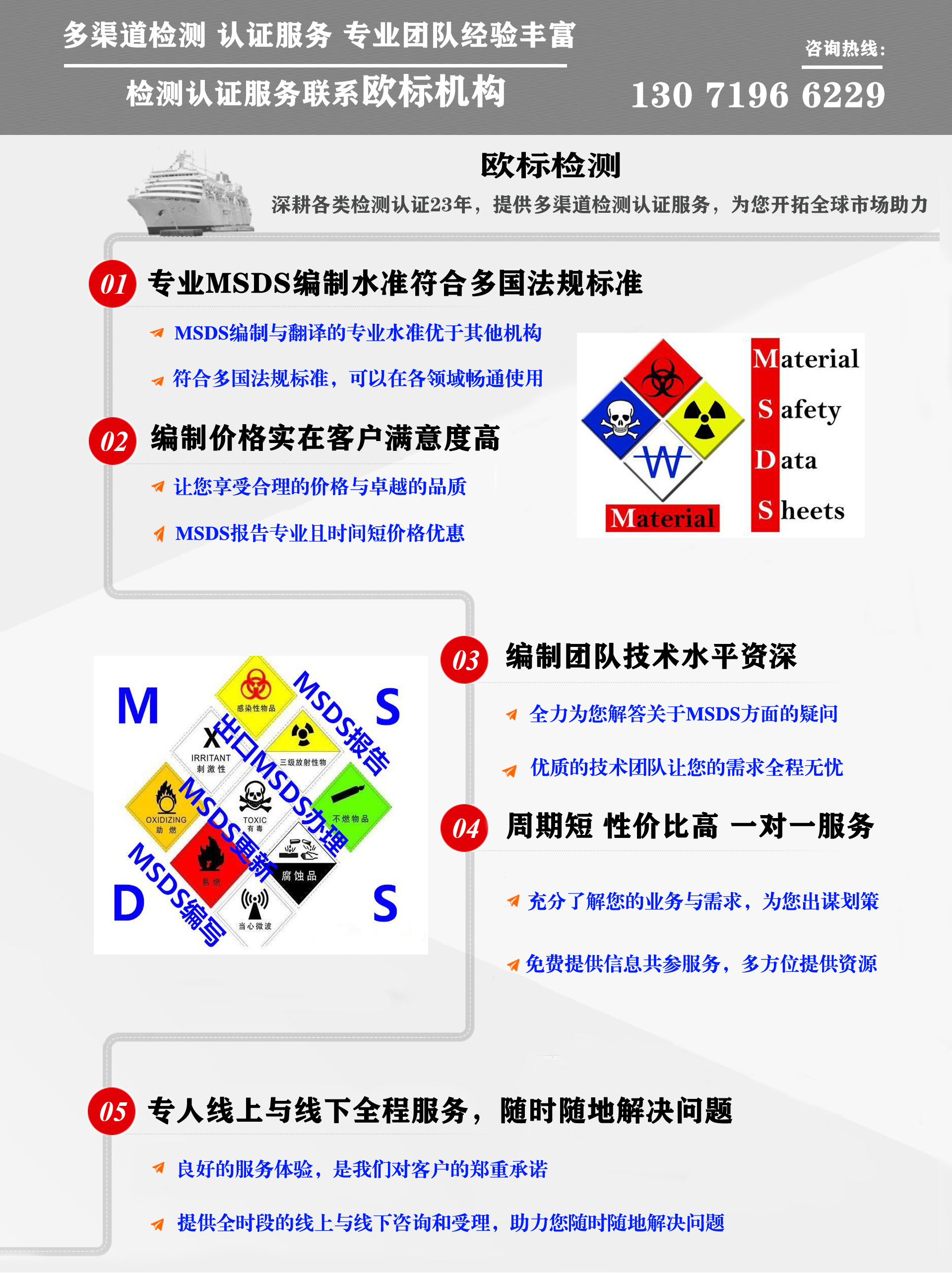 1. MSDS及標(biāo)簽服務(wù):符合多國規(guī)范的MSDS及標(biāo)簽的編制、翻譯、審核服務(wù);